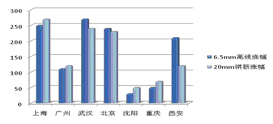 華東、中南地區長材價格漲幅最為明顯,其中:上海市場盤條和鋼筋價格分別上升了7.6%和8.3%;武漢市場盤條和鋼筋價格分別上升了7.9%和7.0%。北京地區價格上升走勢也很明顯,盤條和鋼筋價格分別上升了7.4%和6.8%。