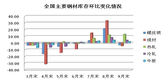 二、上半年去庫存趨勢基本結束,三季度主要鋼材品種庫存呈連續數月環比上升趨勢,這種趨勢在8月份表現得最為充分。9-10月板材庫存繼續增長,但長材庫存開始下降;板材中的冷板和中板升幅收窄,但熱卷庫存環比升幅還在進一步放大。