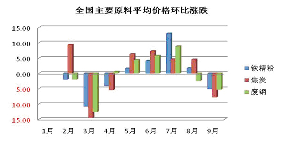 從1-9月全國主要城市原燃材料價格環比變動情況看,二季度以來成本上升的勢頭在三季度末得以逆轉,主要原燃料鐵精粉、冶金焦和廢鋼等價格由升幅收窄轉變為大幅度下降走勢。原料價格的降低為鋼廠降低售價騰出了一定的空間。