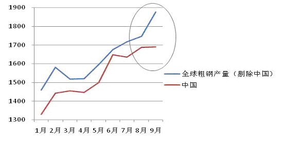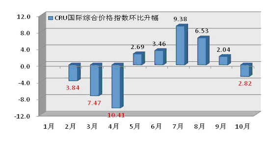 從四季度粗鋼生產情況看,9月份中國粗鋼日產量達到169萬噸,環比僅僅增長了0.1%,而去除中國因素以外的全球其他國家和地區粗鋼日產達到了188萬噸,環比增長年7.4%,明顯快于中國產量增速。實際上隨著全球粗鋼產量的逐步恢復,國際市場鋼材價格在連續五個月環比上升后,已經開始出現回落趨勢,10月份CRU綜合鋼材價格指數降至155.3點,環比下降2.82%。