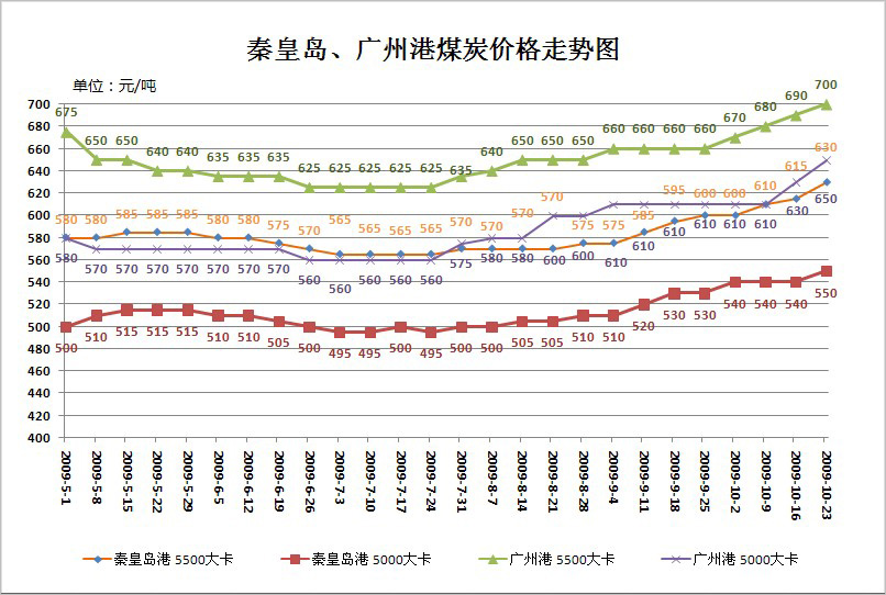 秦皇島、廣州港煤炭價格情況走勢圖