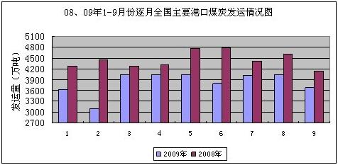 2、主要港口煤炭發(fā)運(yùn)量快速減少。統(tǒng)計(jì)顯示(參見附圖),今年前9個(gè)月各月全國主要港口完成的煤炭發(fā)運(yùn)量普遍低于去年同期水平,運(yùn)量恢復(fù)的基礎(chǔ)或者動(dòng)力(這里指煤炭消費(fèi)和供求形勢)明顯不足,導(dǎo)致各月所完成煤炭運(yùn)量多數(shù)月份處于大幅度萎縮局面。