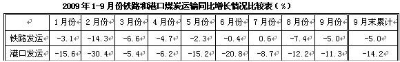整體上看,今年前三季度鐵路和港口煤炭運(yùn)輸全部呈現(xiàn)萎縮局面,增長狀況低于宏觀經(jīng)濟(jì)發(fā)展水平,季節(jié)性用電用煤高峰、煤炭進(jìn)口的大幅度增加和煤炭出口的急劇萎縮、山西省重點(diǎn)地區(qū)煤炭資源偏緊等問題對煤炭運(yùn)輸?shù)挠绊懙玫匠浞煮w現(xiàn)。