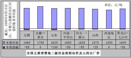 3.焦炭需求減弱,焦炭價格走低。9 月份,焦炭市場整體進入下跌通道,焦化企業再度面臨虧損,限產措施執行力度較大,由于鋼焦聯合企業正常生產,供過于求的狀況并未明顯緩解,焦炭價格仍保持穩中有跌的態勢。為了穩定市場,山西焦協要求焦化企業加大限產幅度,10 月份指導價格暫穩。數據顯示,截至10 月15 日,監測區域內焦炭價格普遍下跌,其中山東、無錫等地跌幅較大,另外,安徽和西南地區價格無變動。