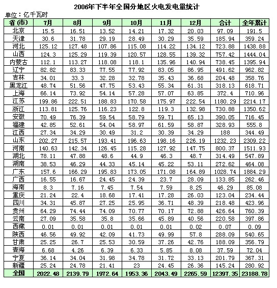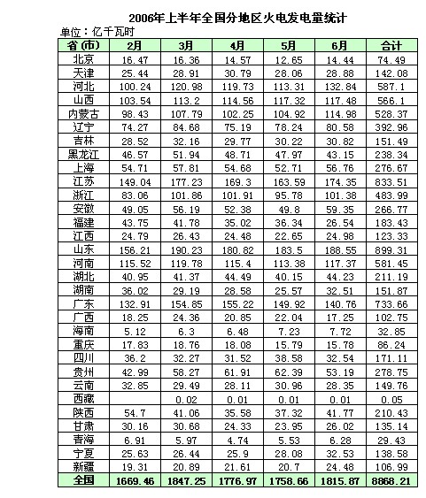 2006年全國(guó)分省市火電發(fā)電量統(tǒng)計(jì)