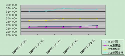 本周CFR東南亞甲醇價(jià)格也上漲。當(dāng)?shù)丶状脊⿷?yīng)緊張,因此價(jià)格受到支撐。貨源緊缺主要是因?yàn)檠b置問(wèn)題。馬來(lái)西亞Petronas甲醇(Labuan)裝置不可抗力可能延長(zhǎng)到2010年中期,印尼Kaltim甲醇裝置停車(chē),導(dǎo)致低庫(kù)存。因此,當(dāng)?shù)貎r(jià)格上漲。
