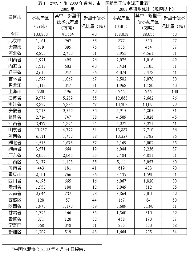 38號(hào)文規(guī)定3年徹底淘汰落后產(chǎn)能。因此,2015年20億噸的水泥消費(fèi)量都將由先進(jìn)的新型干法生產(chǎn)線來(lái)提供。按中國(guó)水泥協(xié)會(huì)的數(shù)據(jù)(表1),2008年水泥總產(chǎn)量為13.88億噸,其中新型干法產(chǎn)量為8.81億噸。因此,到2015年新型干法產(chǎn)量需增加11~12億噸。為保證達(dá)到這個(gè)產(chǎn)量,需增加15~16億噸的產(chǎn)能,相當(dāng)于增加750~800條日產(chǎn)5000噸熟料生產(chǎn)線。扣除在建生產(chǎn)線產(chǎn)能,水泥新型干法生產(chǎn)仍有較大發(fā)展空間。