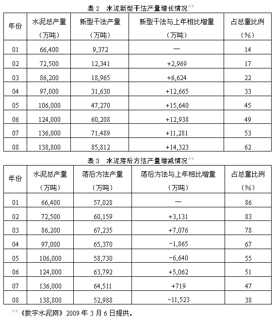 進(jìn)入新世紀(jì)后,水泥工業(yè)結(jié)構(gòu)調(diào)整取得很大進(jìn)步。從表2可看到,新型干法水泥產(chǎn)量占總產(chǎn)量的比例由2001年的14%提高到2008年的62%。從表2和表3的數(shù)據(jù)可以得出,近幾年我國(guó)水泥總量的增長(zhǎng)和結(jié)構(gòu)調(diào)整,主要依靠新型干法的迅速發(fā)展,而落后方法產(chǎn)能的淘汰量并不大。2001年水泥落后方法產(chǎn)量約5.7億噸,2008年約5.3億噸,8年間只下降了0.4億噸。可見(jiàn),淘汰落后生產(chǎn)方法的任務(wù)十分艱巨。為在3年內(nèi)徹底淘汰落后方法產(chǎn)能,必須采取正確方針和得力措施。