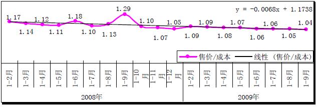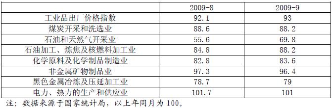 因去年同期國內物價出現持續快速增長,導致今年以來國內工業品出廠價格指數一直低位運行。從9 月份數據來看,除電力行業繼續維持同比上漲勢頭外,煤炭開采和洗選業、石油和天然氣開采業、石油加工業、化學原料及化學制品制造業、非金屬礦物制品業、黑色金屬冶煉及壓延加工業等多行業的工業品出廠價格均同比下降;其中煤炭開采和洗選業、非金屬礦物制品業兩個行業的工業品出廠價格指數環比也出現下降。