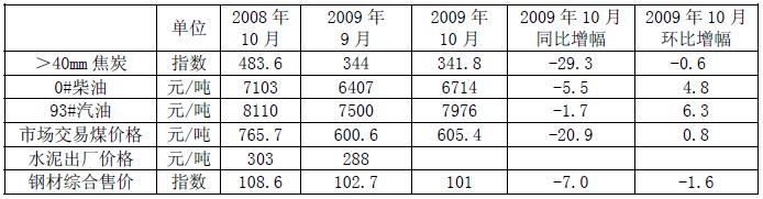 從實際監測煤炭及相關產品價格可以看出,從同比來看,去年同期煤炭及相關產品價格處于高位,因此10 月份煤炭及多種相關產品價格同比均下跌,其中,煤炭價格同比跌幅僅次于焦炭;從環比來看,伴隨著宏觀經濟的持續回暖,煤炭及相關行業產品需求增加,多數價格環比上漲,其中煤炭價格漲幅居中,而焦炭和鋼材綜合售價因需求不旺,環比仍然處于下跌態勢。