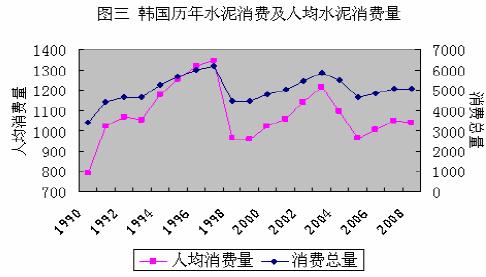 韓國。韓國水泥消費量最高峰發生在1997 年,當時水泥消費總量達到6175 萬噸,人均水泥消費量1343 公斤/人.年。1998 年水泥消費總量一下跌落至4462 萬噸,人均水泥消費量964 公斤/人.年。2001 年水泥消費總量、人均水泥消費量又有所回升,分別達到5000 萬噸、1057 公斤/人.年。自1997 年的消費量最高峰之后,韓國人均水泥消費量在1100 公斤/人.年以上的時期只有2 年,其余是在1000 公斤/人.年上下波動。2008 年韓國水泥消費量為5063 萬噸,人均水泥消費量1042 公斤/人.年。詳見圖三。盡管與日本、中國臺灣相比,韓國水泥1000 公斤/人.年左右人均消費量比較高,且保持了比較長的一段時間,但按照這一消費水平與其歷史最高峰值相比也下降了25%左右。