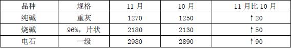 根據國家統計局數據,11 月份純堿產量205.3 萬噸,同比增長52.1%,日產創歷史新高,日均產量環比增長25.3%,1-11 月累計純堿產量1836.9 萬噸,同比增長7.2%;燒堿產量182.7 萬噸,同比增長52.9%,日均產量環比增長6.0%,1-11 月累計燒堿產量1762.7萬噸,同比增長6.8%。