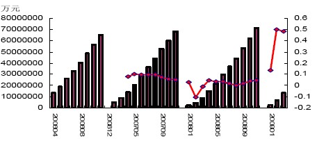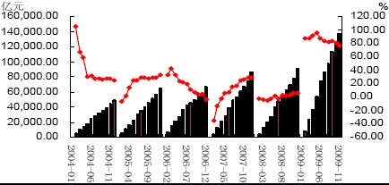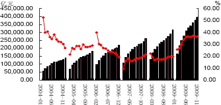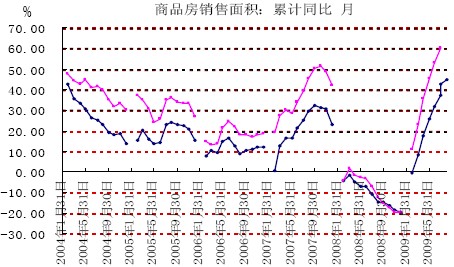 另外,去年四季度以來(lái)中央和地方政府的大規(guī)模投資也在今年的施工項(xiàng)目和開(kāi)工得到體現(xiàn)。2009年1-10月份,累計(jì)施工項(xiàng)目達(dá)到402204個(gè),同比增加95435個(gè),施工項(xiàng)目計(jì)劃總投資375859億元,同比增長(zhǎng)36.6%;新開(kāi)工項(xiàng)目達(dá)到293412個(gè),同比增加85329個(gè),新開(kāi)工項(xiàng)目計(jì)劃總投資達(dá)到124610個(gè),同比增長(zhǎng)81.1%。 圖4:新開(kāi)工項(xiàng)目計(jì)劃總投資額及累計(jì)同比增速 圖5:施工項(xiàng)目計(jì)劃總投資額及累計(jì)同比增速 2.2、房地產(chǎn)投資將成為明年需求的重要看點(diǎn) 對(duì)于房地產(chǎn)繼續(xù)成為明年水泥行業(yè)需求的重要方面,我們的理由如下: 在去年四季度末國(guó)家信貸和行業(yè)優(yōu)惠政策刺激下,09年房地產(chǎn)行業(yè)迅速走出低谷,成交量和成交價(jià)格均大幅上揚(yáng),成交價(jià)格甚至創(chuàng)出新高,之前市場(chǎng)就普遍擔(dān)憂(yōu)政府會(huì)否再一次祭起調(diào)控大旗。但是近期召開(kāi)的中央經(jīng)濟(jì)工作會(huì)議表明,“加強(qiáng)和改善宏觀調(diào)控,實(shí)施積極的財(cái)政政策和適度寬松的貨幣政策”、“要把滿(mǎn)足居民合理改善居住條件愿望和發(fā)揮房地產(chǎn)支柱產(chǎn)業(yè)作用結(jié)合起來(lái),增加保障性住房供給,減輕居民合理購(gòu)買(mǎi)自住商品住房負(fù)擔(dān),發(fā)揮房地產(chǎn)在擴(kuò)大內(nèi)需中的積極作用”政府對(duì)未來(lái)房地產(chǎn)行業(yè)的發(fā)展還是采取了相對(duì)鼓勵(lì)和肯定的態(tài)度。應(yīng)該來(lái)說(shuō),在公告中,中央再次強(qiáng)調(diào)了房地產(chǎn)的支柱產(chǎn)業(yè)地位,并且指出要保持房地產(chǎn)市場(chǎng)穩(wěn)定健康發(fā)展,并且作為明年擴(kuò)大內(nèi)需、促進(jìn)經(jīng)濟(jì)平穩(wěn)發(fā)展的主要支柱。 圖6:商品房銷(xiāo)售面積累計(jì)同比增速