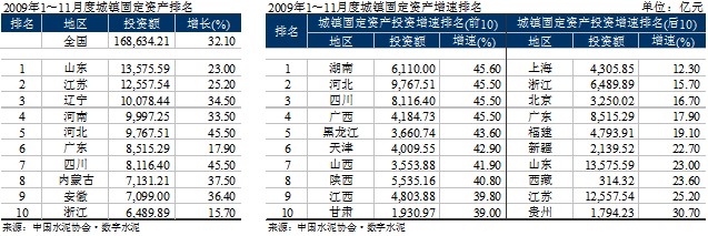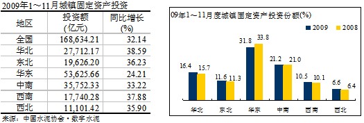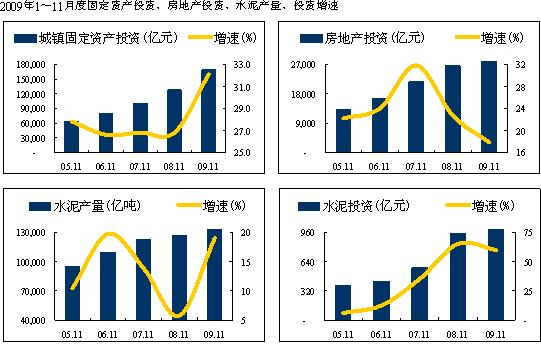 在擴內(nèi)需政策的拉動下,需求快速增長,利潤水平增長,拉動水泥投資持續(xù)火熱: 1~11月全國水泥投資1,505.61億元,同比增長59.8%,與去年同期持平,但仍處于高位增長區(qū)間。預(yù)計2009年全年水泥投資約1,650~1,700億元,投資額比2008年約增加600~650億元。