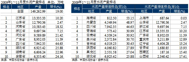 1~11月份,水泥市場逐漸見旺,產(chǎn)量以較高的速度增長,全國水泥產(chǎn)量14.93億噸,同比增長19%,增幅比去年同期提高了13.3個百分點。預(yù)計09年全年產(chǎn)量約16.4億噸,比08年約增加2.4億噸,同比增長約為17%。