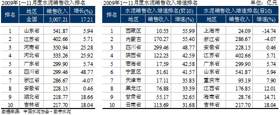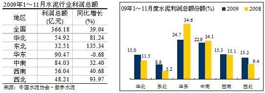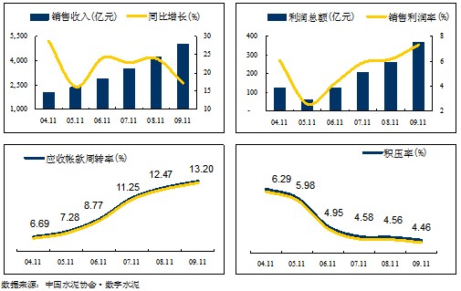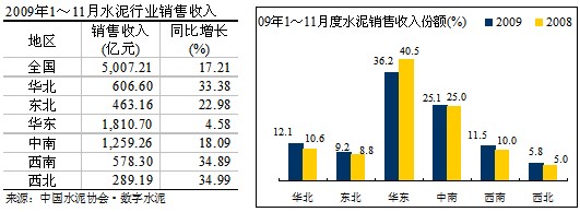 2009年1~11月,水泥市場在高需求的環(huán)境下,使得去年釋放的2億噸水泥產(chǎn)量基本消化,帶動了各項經(jīng)濟指標的提高:除銷售收入的增速低于去年外,利潤、銷售利潤率、應(yīng)收賬款周轉(zhuǎn)率、積壓率等各項指標都不同程度的優(yōu)于去年。但在各個區(qū)域之間表現(xiàn)不一,分化明顯。