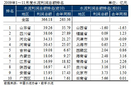 在摸索中奮進,種種迷霧和不確定性逐漸明朗。1~11月份數(shù)據(jù)顯示,盡管2009年產(chǎn)能釋放壓力前所未有,但在國家拉動經(jīng)濟政策下,水泥需求超預(yù)期,拉動水泥利潤總額、銷售利潤都高于去年水平。