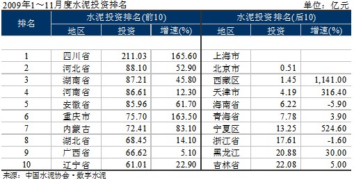 投資前10的省(區(qū)、市)主要來自中南、西南地區(qū),政府西部開發(fā)的傾向與經(jīng)濟發(fā)展的偏移,也是西部水泥高投資的原因。其中四川地區(qū)受災(zāi)后重建拉動,水泥投資額與水泥投資增速均高居全國第一,投資額為211.03億元,同比增長165.6%。