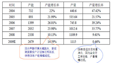 近年來國家大力推進石油替代戰略,我國甲醇行業發展迅速,產能擴張步伐加快,僅五年時間,國內甲醇產能就增加了四倍之多。08年受金融危機的影響,部分廠家新建裝置投產計劃推遲,國內產能增長率減緩,增幅在10%。隨著國民經濟的復蘇,2010的國內新建產能將會集中投產,屆時國內產能將突破3000萬。