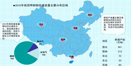 圖為2010年我國甲醇新投建裝置主要分布區域圖