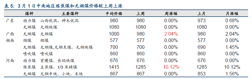 3 月1日中南地區煉焦煤和無煙煤價格較上周上漲