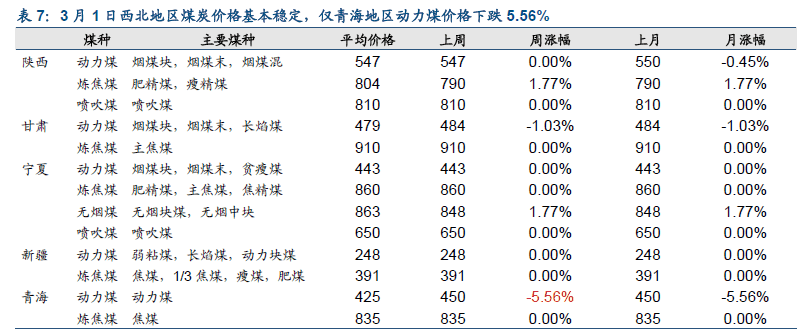 3 月1 日西北地區煤炭價格基本穩定,僅青海地區動力煤價格下跌5.56%