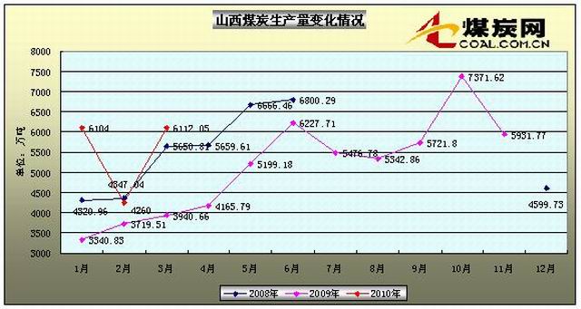 3月份,全國主要煤炭產區原煤產量均呈較快增長勢頭,增幅多在兩位數。統計數據顯示,3月份,山西、內蒙、陜西原煤產量依次位列全國前三,分別完成原煤產量6112萬噸、6064萬噸、2712萬噸,分別同比增長60.76%、26.24%以及18.98%。3月份,以上三省原煤產量占全國比重達到53.2%,與1、2月份相比,分別提高0.7和0.2個百分點,煤炭生產的區域集中度持續提高,山西任然居于首位。比二月原煤生產多1852.5萬噸