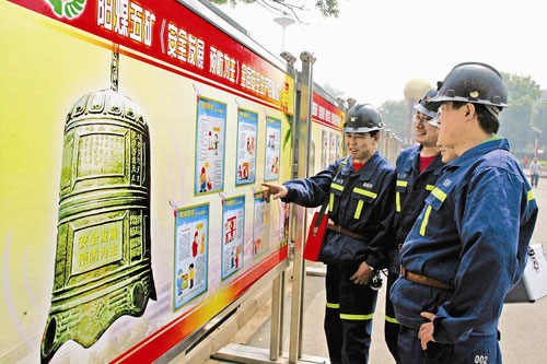 6月13日,陽(yáng)煤五礦舉行了安全生產(chǎn)宣傳咨詢(xún)?nèi)栈顒?dòng),號(hào)召職工從自身做起,學(xué)習(xí)安全知識(shí),提高安全意識(shí),進(jìn)行安全生產(chǎn)。圖為礦工正在觀(guān)看安全生產(chǎn)宣傳板面。