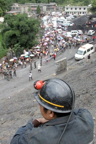 8月3日,一名礦工在貴州仁懷市長崗鎮明陽煤礦等待同伴的消息。