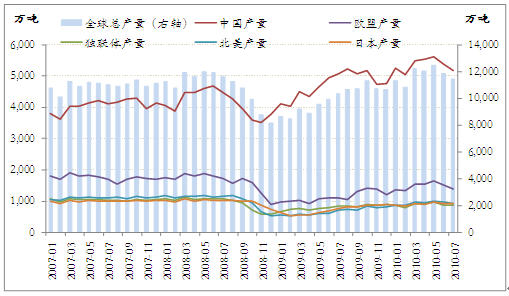 值得注意的是,2008年的金融危機之后,盡管全球粗鋼總產量受各國鋼企大幅減產影響明顯下降,但我國粗鋼產量在全球的占比卻有一個顯著的上升。雖然經濟危機期間,世界各國普遍實施了對經濟的刺激政策,但從主要國家和地區的粗鋼產量來看,歐美日等國的產量在2008年大幅下滑后并未能很快恢復,這主要在于這些國家的經濟刺激政策大多以放寬信貸與刺激消費為主,對鋼鐵行業的直接推動力較小,且歐美等國汽車及房地產業長期未能走出低谷,其鋼材消費的低迷也在很大程度上影響了這些地區鋼鐵行業的復蘇。而與此不同的是,我國政府在放寬信貸及刺激消費的同時,還給經濟注入了四萬億基礎建設投資的強心劑,這對于國內鋼鐵行業走出危機可謂極大的動力,也在很大程度上帶來了經濟危機后國內鋼鐵業的迅速恢復及產能的持續擴大。