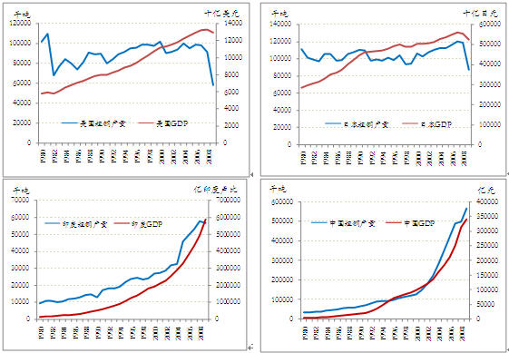 圖3 1980年以來美、日、印、中四國粗鋼產量與GDP對比