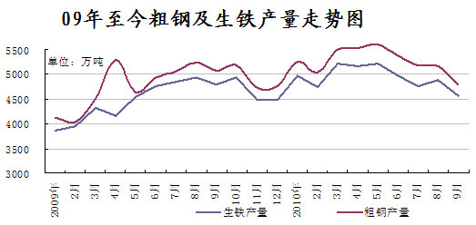圖2:2009-2010年9月生鐵及粗鋼月度產(chǎn)量走勢(shì)圖