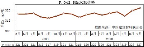 據(jù)統(tǒng)計,9 月份重點聯(lián)系水泥企業(yè)42.5 級普通硅酸鹽水泥平均價格為326.61 元/噸,環(huán)比增長0.74%,同比增長3.08%。