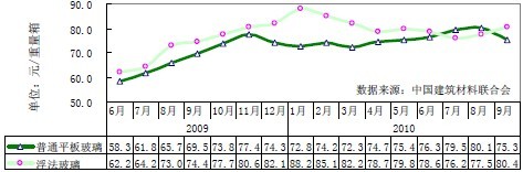 浮法玻璃價格明顯上漲。據(jù)統(tǒng)計,9 月份重點聯(lián)系玻璃企業(yè)浮法玻璃平均價格為80.4元/重量箱,環(huán)比增長3.7%,同比漲幅為8.1%;普通平板玻璃價格由升轉(zhuǎn)降,9 月份平均價格為75.3 元/重量箱,環(huán)比下降6.1%,同比增幅8.34%。