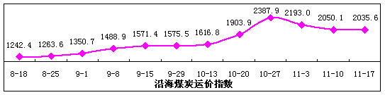 【運價】本周沿海煤炭運價格繼續盤整,但已現企穩態勢。由于廣州亞運會的召開,到廣州港的船舶安檢嚴格,因此,從環渤海煤炭港口到廣州港方向的拉煤船舶有所減少,運費保持在較高的水平。11月17日,秦皇島至上海和寧波的運價分別均為64元/噸,比上周分別上升1元/噸和下降 1元/噸,天津、京唐至上海的航線運價也為64元/噸,與上周持平。秦皇島至廣州的航線運價為74元/噸,比上周下降2元/噸。經歷集中搶運之后,沿海煤炭運輸市場逐漸恢復平靜,但目前仍處于“冬儲”階段,部分貨主仍不肯放棄運力,加之電廠仍具有補充庫存愿望,對大船需求量有所加大,運價或將略有上漲,但幅度不會太大。