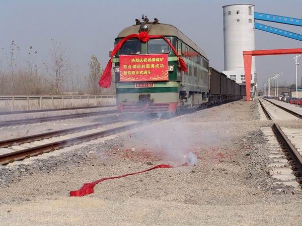 伴隨著一聲長(zhǎng)鳴,東風(fēng)7787號(hào)列車緩緩駛出楊柳煤礦,鐵路專用線也正式通車。