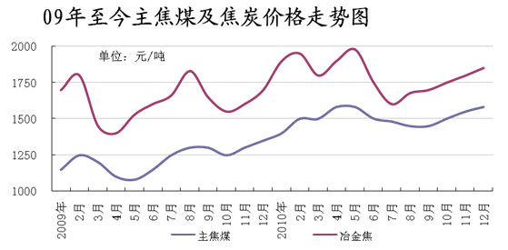 圖1:2009-2010年12月山西主焦煤及焦炭月度價格示意圖