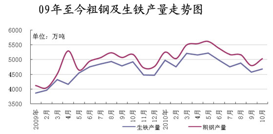 圖2:2009-2010年10月生鐵及粗鋼月度產量走勢圖
