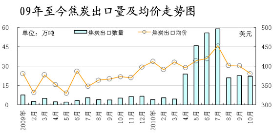 圖4:2009-2010年10月焦炭月度出口量及均價走勢圖