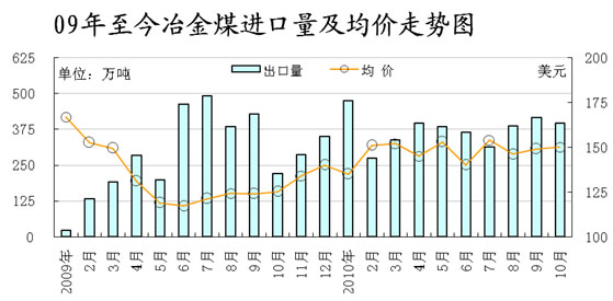 圖5:2009-2010年10月冶金煤月度進口量及均價走勢圖