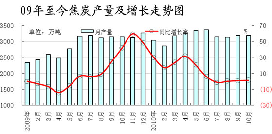 據統計局數據顯示:2010年10月份中國共生產焦炭3,196.3萬噸,比去年同期增加42.6萬噸,同比增加 1.4%。中國1-10月焦炭總產量為32027.7萬噸,累計比去年同期增加3333.6 萬噸,累計同比增長11.6%。1-10月份國有重點煤礦煤炭產量14.31億噸,累計同比增長16.7%。1-10月份粗鋼產量達到5.25億噸。