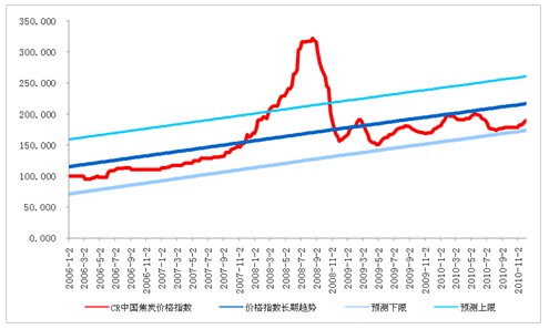 圖2 CR中國(guó)焦炭?jī)r(jià)格指數(shù)歷史趨勢(shì)及預(yù)測(cè)范圍