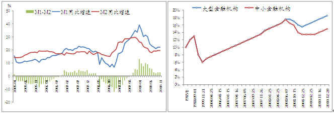 據統計局公布數據,11月末,廣義貨幣(M2)余額71.03萬億元,同比增長19.5%,增幅比上月高0.2個百分點,比上年同期低10.2個百分點;狹義貨幣(M1)余額25.94萬億元,同比增長22.1%,增幅與上月持平,比上年同期低12.5個百分點。雖然同比增速開始回歸常態,但M1和M2絕對量穩步走高,仍處于歷史高位,M2余額是前3季度GDP總量(為26.9萬億元)的2.64倍,前期4萬億投資等刺激經濟的政策帶來巨大的流動性。