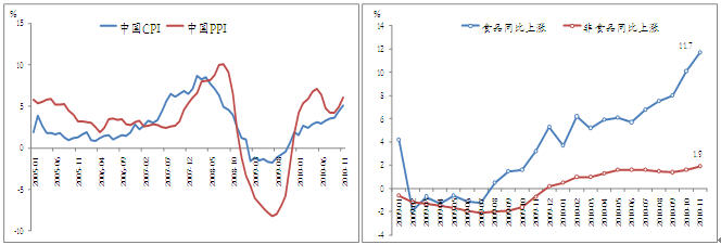大量的貨幣投放是國內的物價飆升、CPI高企的重要因素之一。11月份居民消費價格CPI同比上漲5.1%,工業品出廠價格PPI同比上漲6.1%。CPI連續5個月、PPI連續3個月同比上漲。主要原因是食品價格的大幅上揚,11月食品價格上漲11.7%,非食品價格只上漲1.9%。11月采掘工業上漲14.6%,原材料、燃料、動力購進價格同比上漲9.7%,原材料價格和人工成本的上升推高了PPI的上漲,后期仍可能將維持高位。