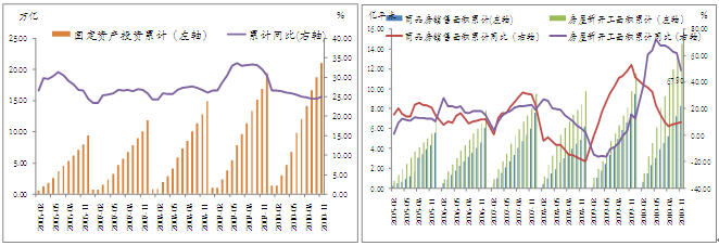 1-11月份,城鎮固定資產投資210698億元,同比增長24.9%,比1-10月份加快0.5個百分點。其中,房地產開發投資42697億元,增長36.5%。分產業看,1-11月份鐵路運輸業投資5822億元,增長25.3%,表現突出。從施工和新開工項目情況看,1-11月份累計施工項目439758個,同比增加10288個;施工項目計劃總投資498297億元,同比增長26.8%;新開工項目301937個,同比減少15075個;新開工項目計劃總投資172345億元,同比增長25.9%。前期開工項目的延續使得施工項目投資增速稍高于新開工項目投資,后期隨著天氣的轉冷,項目數量和增速也將出現回落。但我們依然看好“十二五”規劃頭年的固定資產投資表現。政策連續對房地產調控,商品房的銷售面積處于回落之中,新開工面積在11月份回落幅度較大,明年1000萬套的保障性住房建設將支撐房屋新開工面積的高增長。