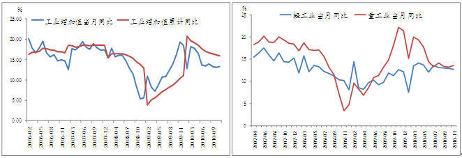 11月份規模以上工業增加值同比增長13.3%,比10月份加快0.2個百分點;1-11月份,規模以上工業增加值同比增長15.8%,比1-10月份回落0.3個百分點。分行業看,黑色金屬冶煉及壓延加工業增長4.9%,低于其他行業;重工業增長13.6%,輕工業增長12.7%。分產品看,粗鋼5017萬噸,增長4.8%;水泥17658萬噸,增長17.3%;汽車182.1萬輛,增長27.6%。由于節能減排等影響,粗鋼產量增速較低,汽車等行業仍保持高的增速。重工業增速止跌反彈,輕工業繼續小幅回落。