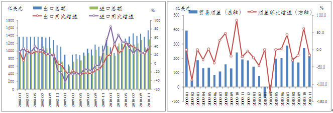 據海關統計,11月份,我國進出口值2837.6億美元,同比增長36.2%,環比增長15.9%,刷新今年9月份創下的2730.9億美元的紀錄,月度進出口規模首次超過2800億美元關口。其中出口、進口值同時創新歷史最高紀錄:11月份出口1533.3億美元,增長34.9%;在進口量和價格上漲的推動下,11月份進口1304.3億美元,增長37.7%,進口增速比10月份快速提升12.3個百分點。外商投資企業為貿易順差主要來源,這也是國外資本進入國內的一條重要途徑;民營企業進出口強勁增長,新興國家的快速復蘇加大了對我國出口品的需求,12月國外圣誕節臨近,部分企業提前采購,季節性需求穩步增長。