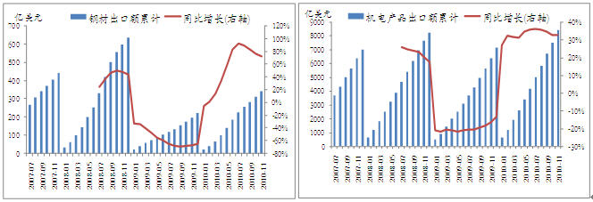 鋼材出口和機電產品出口情況。1-11月,我國機電產品出口8427.4億美元,增長32.7%,占同期我國出口總值的59.2%。其中電器及電子產品出口3508億美元,增長31%;機械設備出口2795.9億美元,增長33%。機電產品出口的穩步增速是11月份進出口數據表現強勁的重要貢獻力量。鋼材出口的高增長是去年同期基數較低的原因所致,由于海外鋼材的供給增加和需求滯后,總體上看,還是持謹慎看待的觀點。
