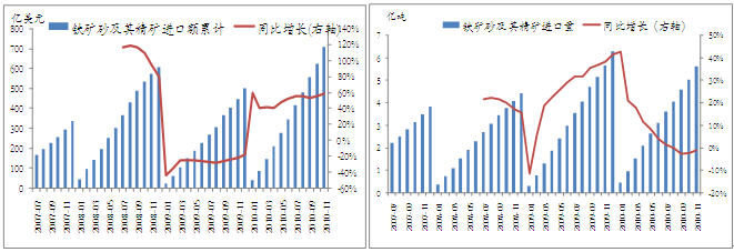 鐵礦石進口。11月鐵礦砂及其精礦進口量為5738萬噸,與去年同期持平;1至11月,鐵礦砂進口5.6億噸,下降0.9%,進口均價為每噸126.4美元,上漲59.7%;進口金額同比增長58.3%。也就是說,季度定價模式下,在進口同等數量礦石中,多支付一半的費用。