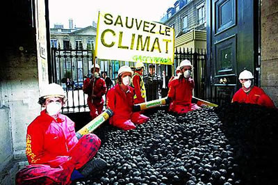 圖片為2009年6月23日,“綠色和平”環保組織成員將煤傾倒在位于巴黎的法國生態部門前并舉行靜坐示威,以抗議法國在西北部瑟堡港興建煤炭碼頭的計劃。在歐盟,類似這樣反對發展煤炭工業的抗議活動時有發生。